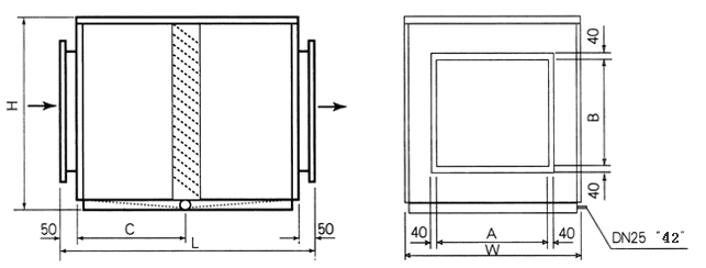 1、 風(fēng)管濕膜加濕器的風(fēng)管寬度w、高度h、風(fēng)管的進出風(fēng)口寬度A、高度B應(yīng)視具體情況而定。 2、 A、B尺寸原則上應(yīng)根據(jù)風(fēng)道尺寸確定。 3、 W、H尺寸原則上應(yīng)根據(jù)風(fēng)道送風(fēng)量設(shè)計確定,設(shè)計時應(yīng)盡量保證濕膜的迎面風(fēng)速在2.2-2.7m/s為佳。 4、 選擇W、H尺寸還要視風(fēng)管周圍有無障礙物等具體情況合理選擇。