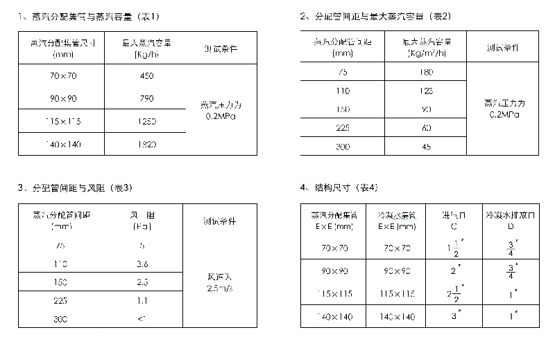 5、蒸汽快速擴散器超低空氣阻力:由于蒸汽分配支管為圓柱狀,所以空氣阻力很小。管間距75mm的擴散器,在2.5m/s風速下,阻力僅5Pa左右。